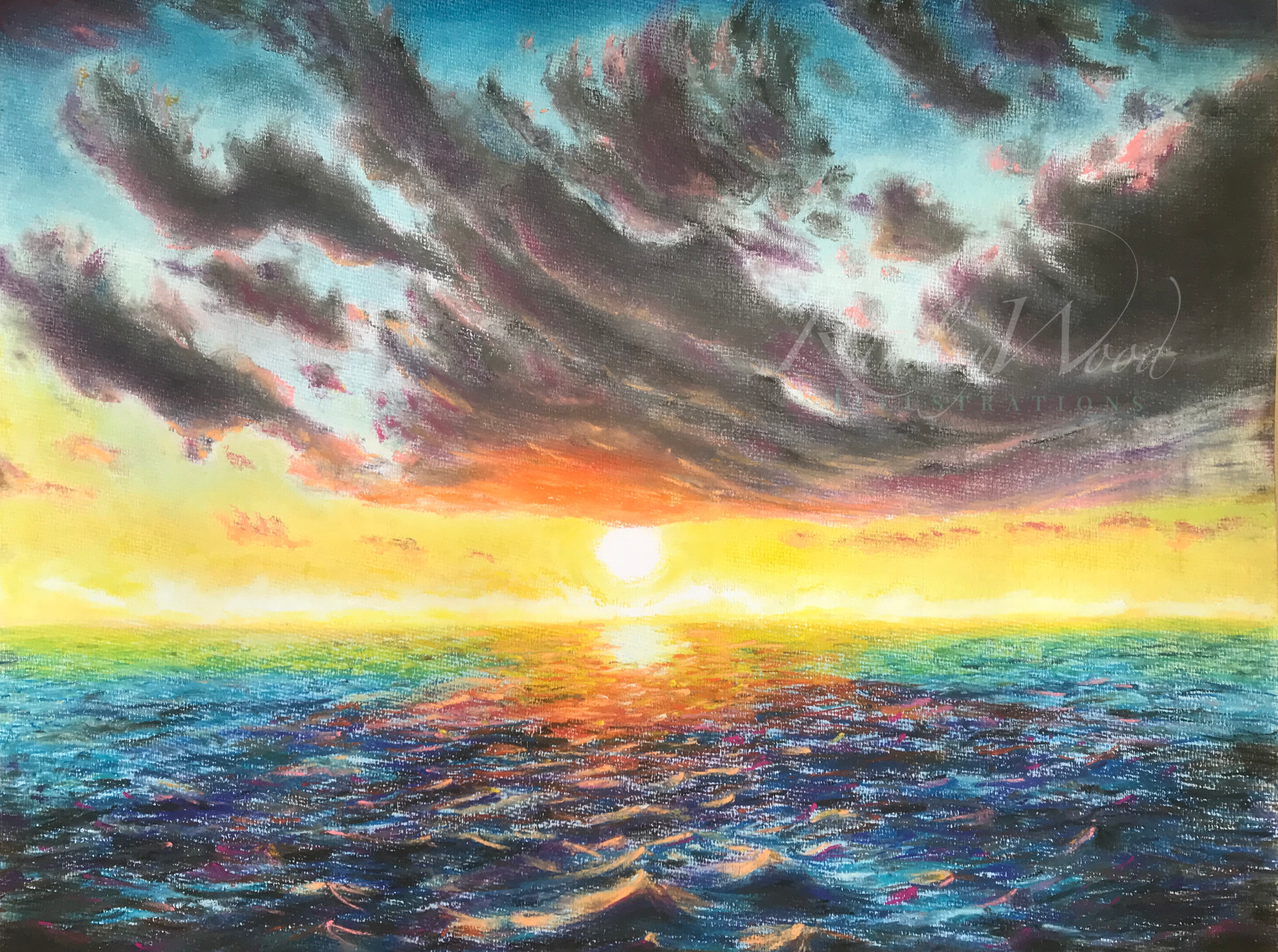 This A5 Greeting Card, titled 'The Balmy Breeze', features artist John Ridley's pastel piece depicting a beautiful sunset over a serene sea. Made by the artist himself, this card is printed on 250gsm hammered cardstock and comes with a blank interior for personalization. It also includes a white envelope for convenience.